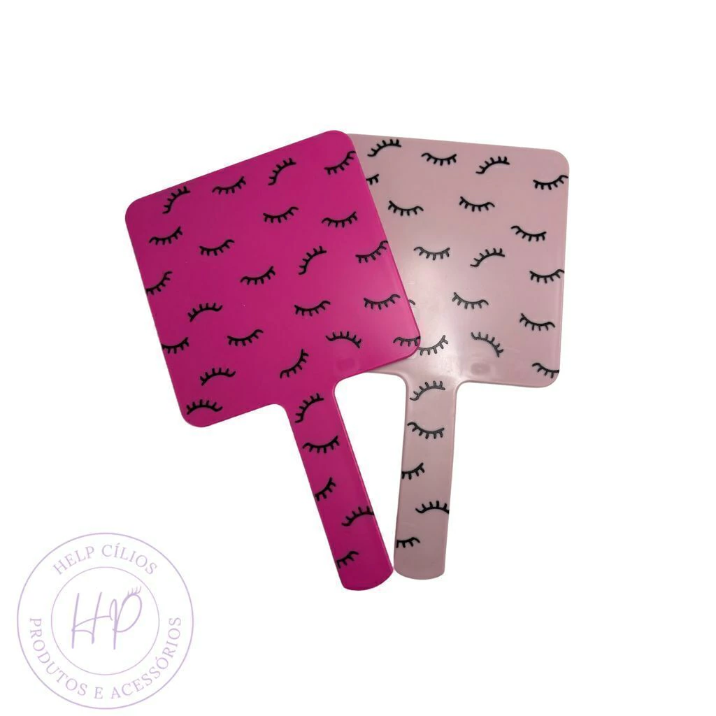 Espelho de Mão CíliosEspelho de mão quadrado cor rosa pink, rosa claro ou preto com desenhos de cílios preto ou branco.Medidas: 16 x 9cm